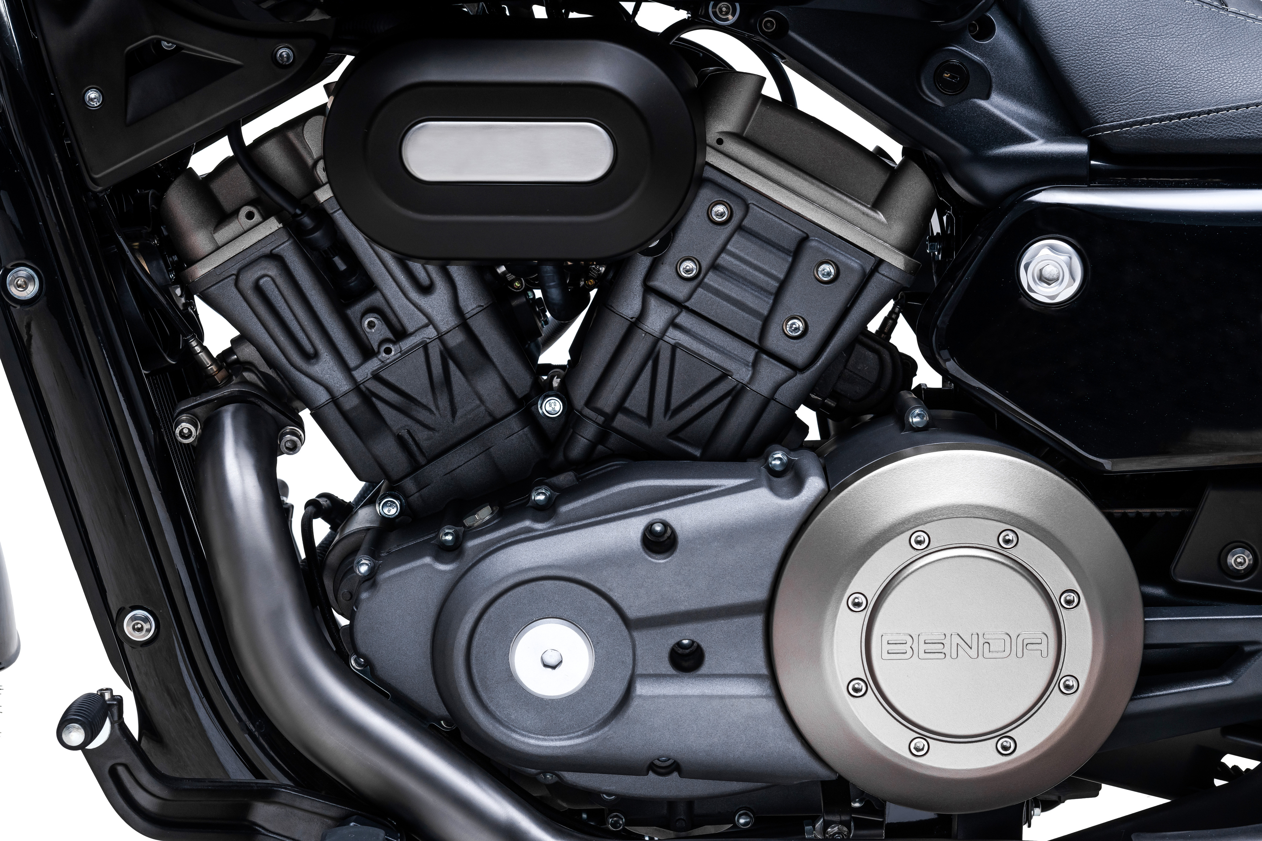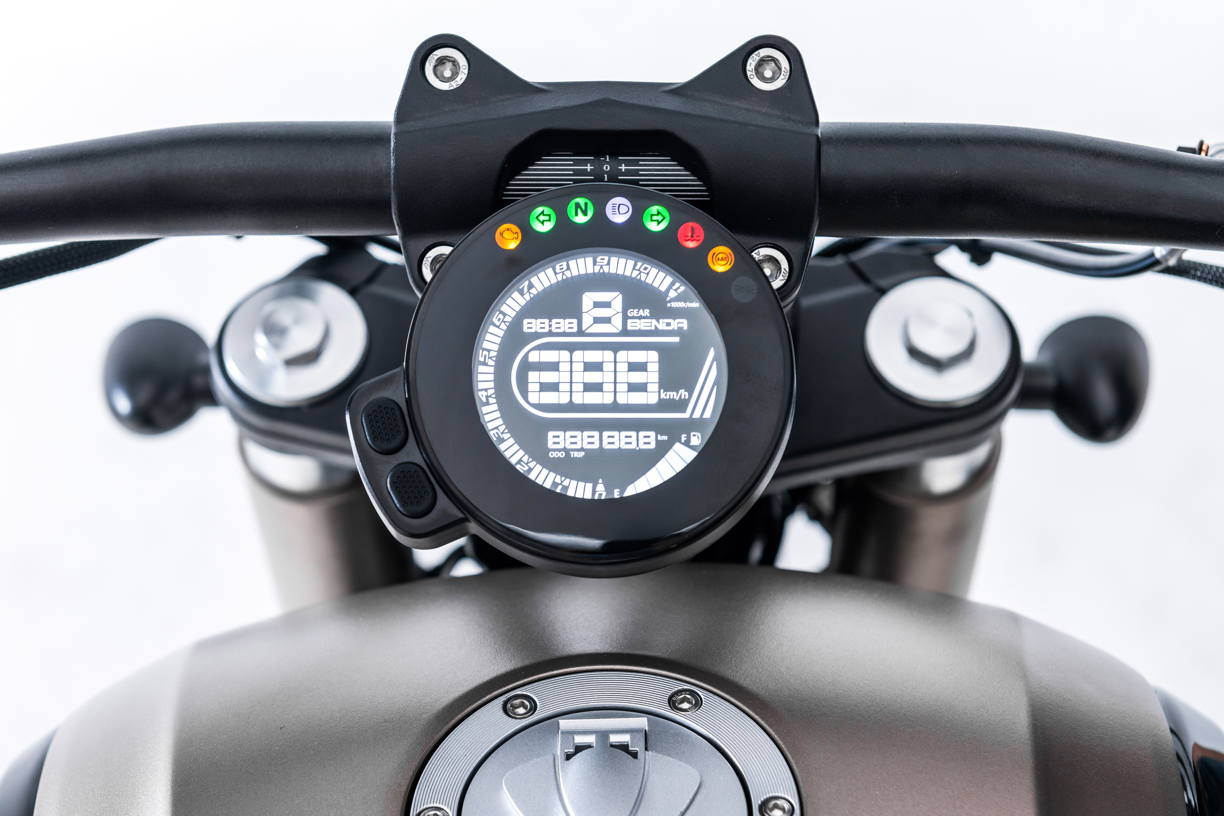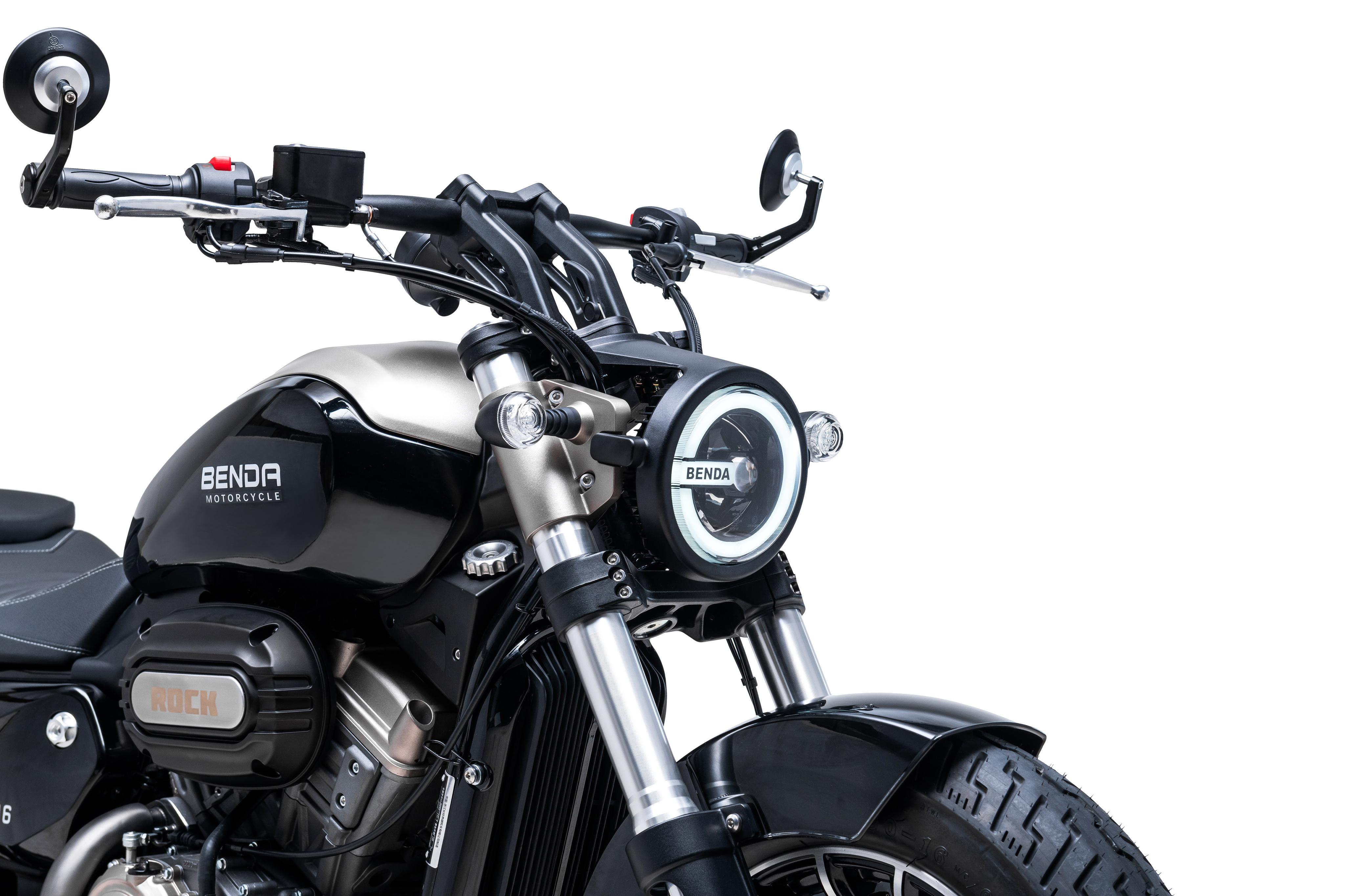 Наиболее серьёзное изменение – увеличенная на 100 мм колёсная база. Её длина у Benda Rock 300 стала 1520 мм – это именно столько, сколько, например, у Harley Davidson Sportster S. За рулём Benda Rock 300 сможет легко разместиться райдер практически любого роста. Прямой руль типа «дрэгбар» немного сместили назад, а стойки руля сделали выше. Посадка стала более комфортной, не утомляющей водителя.
