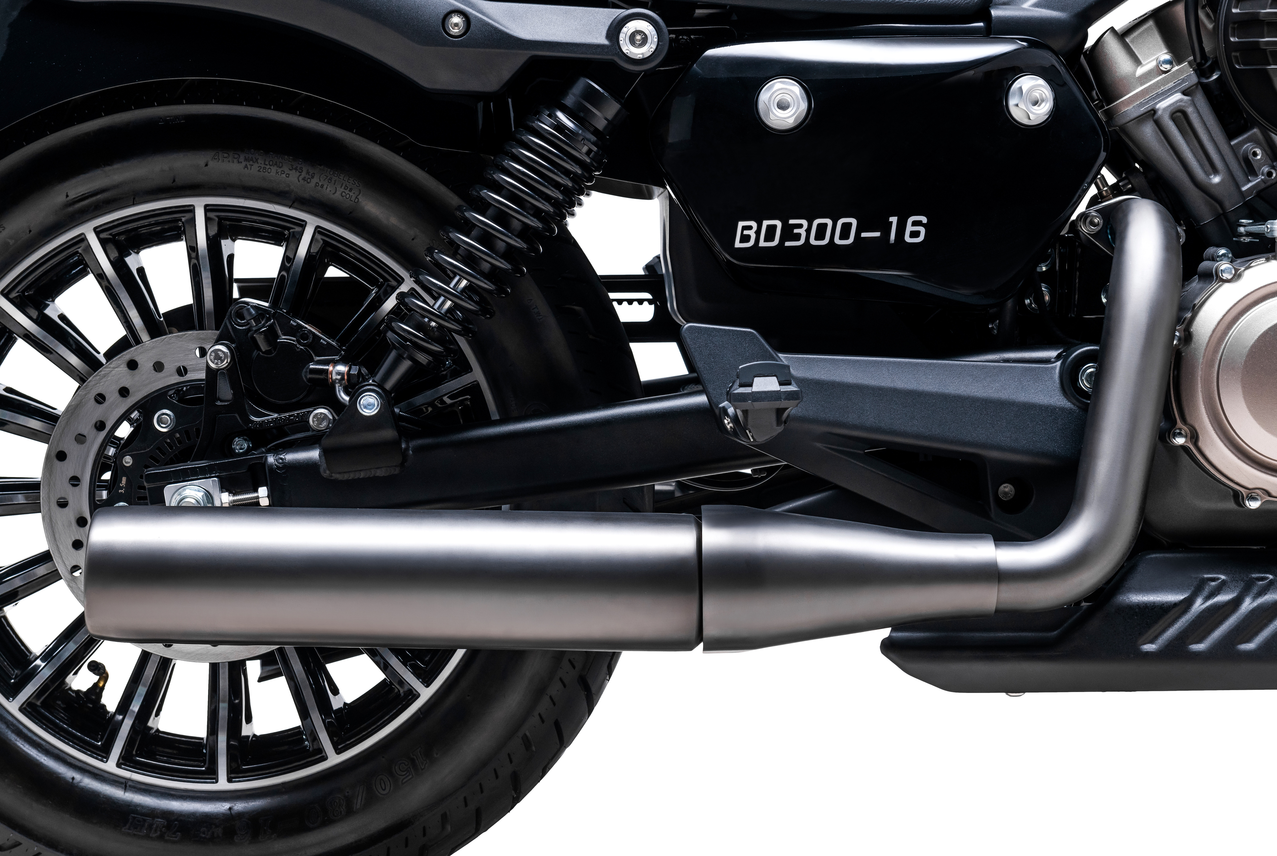 Стильные глушители Rock 300 выведены на две стороны. Глубокие крылья Benda Rock 300 эффективно защищают экипаж от воды и пыли, а 16-литровый топливный бак в сочетании со скромным, около 3 литров на 100 км пробега, расходом топлива обеспечивает мотоциклу внушительный запас хода.