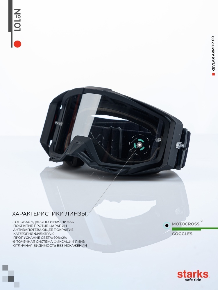 Профессиональная топовая модель в линейке мотоочков STARKS. Мотоочки отличаются самым лучшим термокомфортом в большом диапазоне погодных условий, стойкостью к запотеванию и широкой нескользящей лямкой Линзы имеют большую площадь, что дает по сравнению с аналогами лучший обзор.  Установлены линзы из поликарбоната, являются ударопрочными, имеют стойкость к образованию царапин, а также с завода имеют АНТИФОГ эффект.